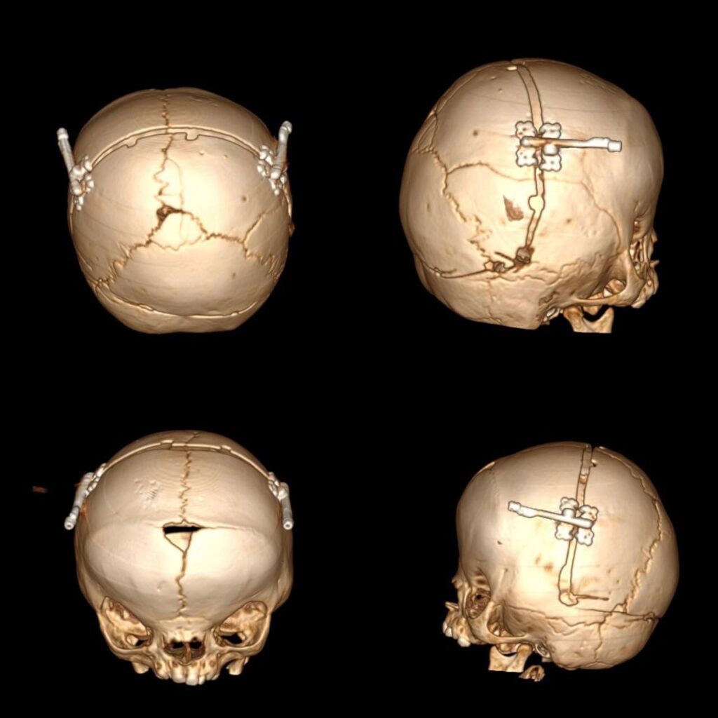 🔸Дистрактори для збільшення об’єму черепа Емілія носила упродовж місяця. Нещодавно нейрохірурги провели завершальний етап лікування краніосиностозу – видалення конструкції. Після короткого періоду відновлення нейрохірургічна команда проведе дівчинці ще одне втручання з виправлення рис обличчя.