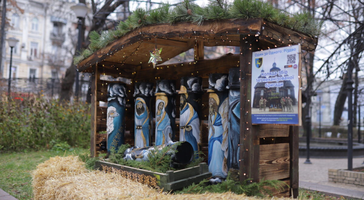 Цього року вертепи, де персонажі традиційного вертепу Ісус, Марія, Йосип й інші зображені на розписаних професійними художниками тубусах. А шопки, декоровані гірляндами, гілками хвої та тюками сіна, виготовлені з дошок палетування й ящиків бойового комплекту військовими.